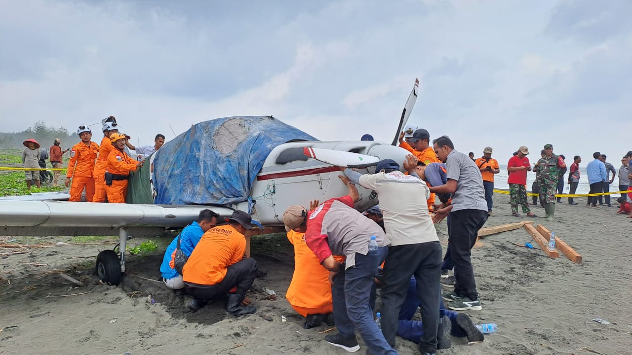Pesawat Latih PK-PCB Mendarat Darurat di Pantai Cemara Sewu